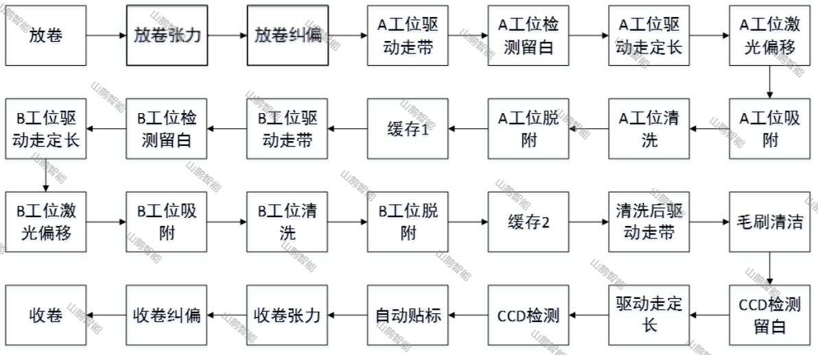 卷对卷极片通过激光对材料表层清除气化,或者其它行业需要激光表面清洁处理的非标定制。 使用激光将冷压后电池极片的涂膏区按要求的间隔尺寸进行局部清洗、除尘、效果检测等。 针对数码软包电池正反面极片上的活性物质快速烧除、气化,裸露出中间的金属导电集流体,并使之能达到电池 TAB 焊接的要求; 包含:放卷机构,纠偏机构,张力控制机构,正反面激光清洗机构,毛刷除尘机构, CCD外观检测机构,收卷机构等。采用PLC控制,具有故障检测功能。触摸屏操作、参数显示与设定方便快捷。设备结构合理、紧凑、自动化程度高 |